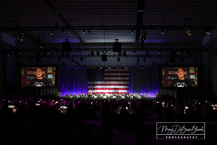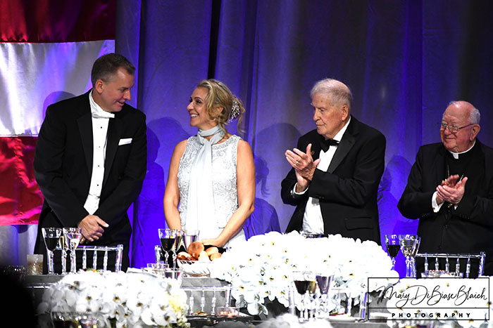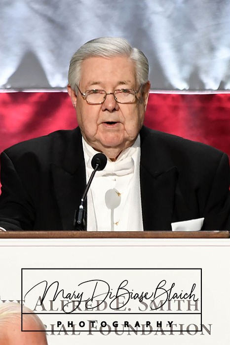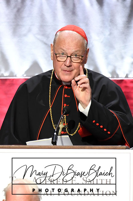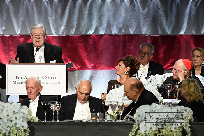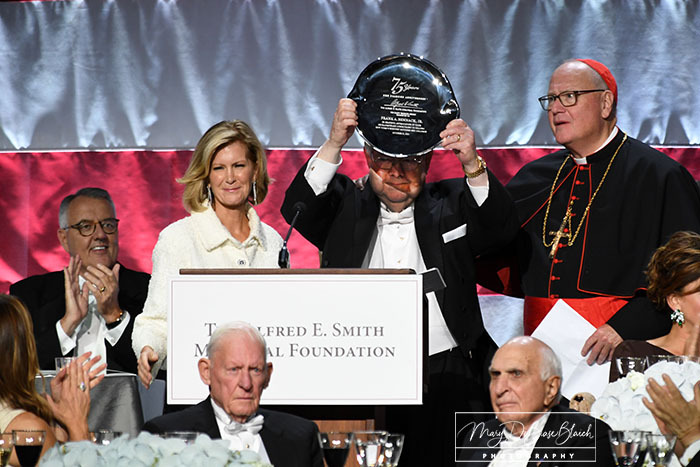 Secretary Rice shared the dais with Timothy Cardinal Dolan, Archbishop of New York. This year’s “Happy Warrior” award recipient was Mr. Frank Bennack, Jr who received his award from Mary Callahan Erdos, Vice-Chair of the Alfred E Smith Foundation. The evening also featured a prerecorded video by President George W. Bush, a former Keynote Speaker who wore a T-shirt with a tuxedo print on the front.
