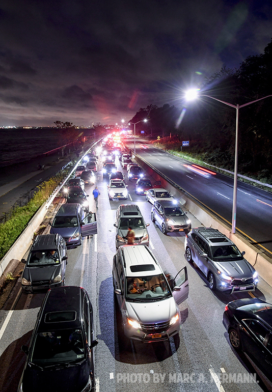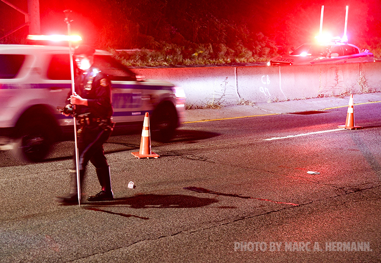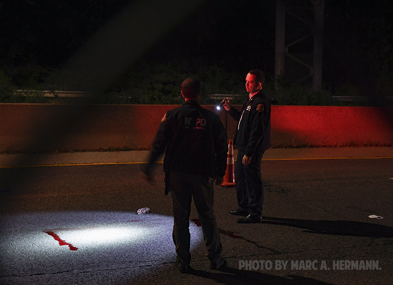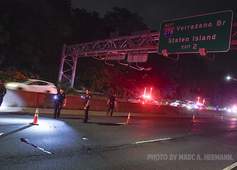 Accident on the Belt Parkway Scene on the Belt Parkway near 93rd St. on the evening of Sun., October 10, 2021 where a person was struck by a vehicle and seriously injured in the eastbound lanes, and transported to NYU Langone-Brooklyn. Photos by Marc A. Hermann