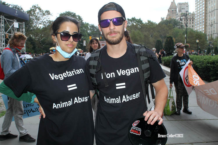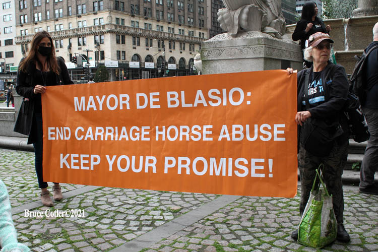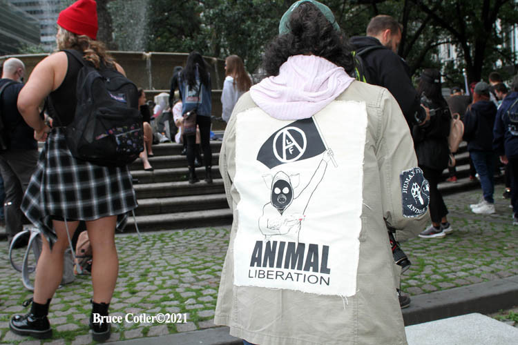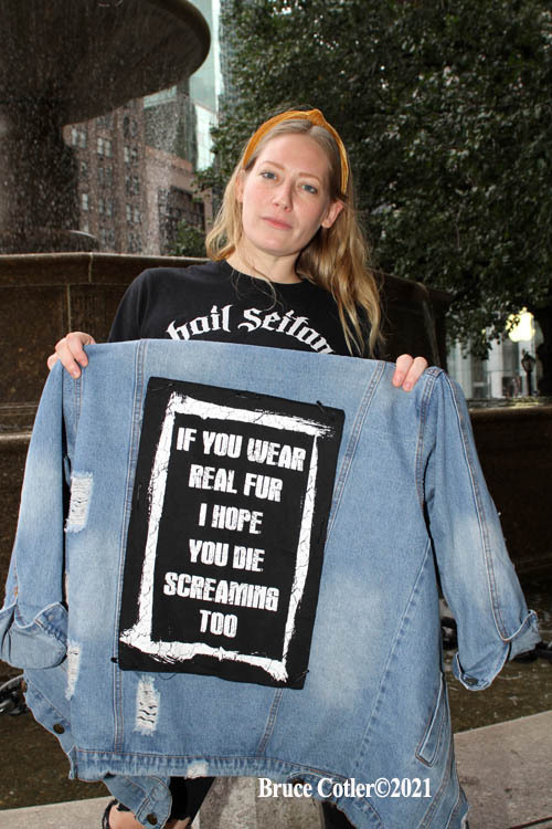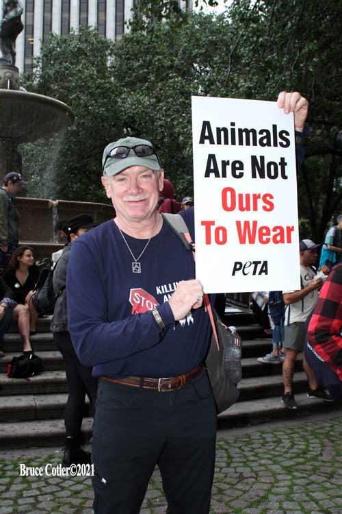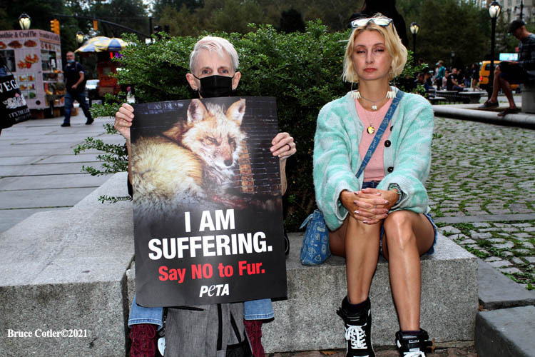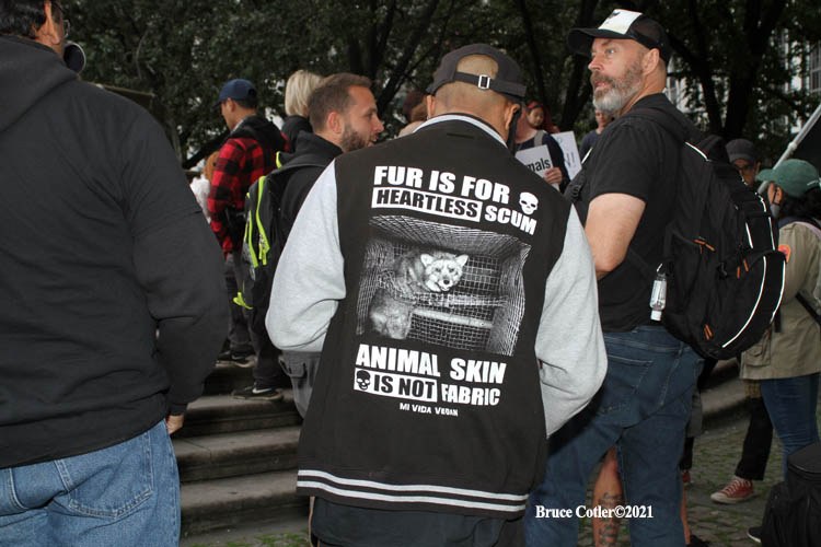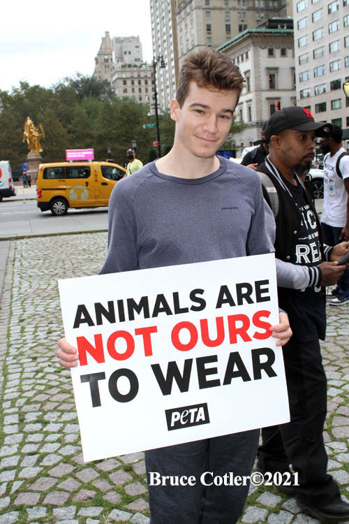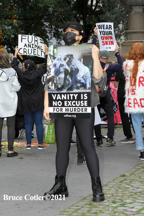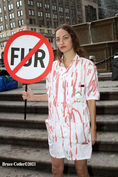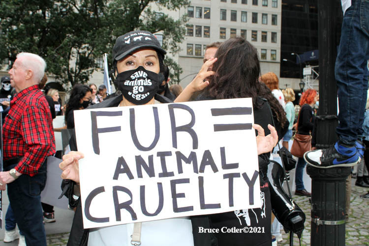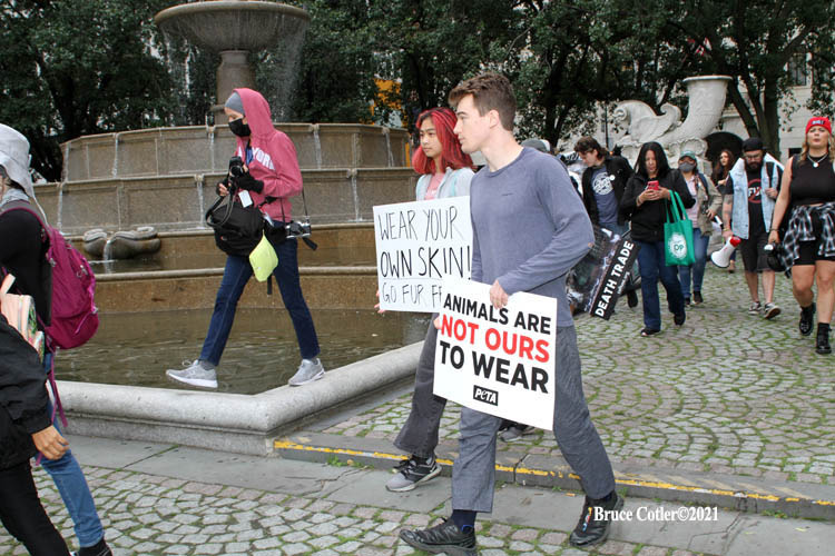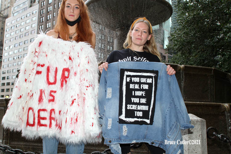 Protesters come together to rally against fur production and fur trade as well as animal rights on 59th street in Midtown Manhattan. Starting from Pulitzer fountain and marching to Central Park where horse carriages are stationed, they continued to several selected stores such as Dior and Celine and more to protest their sales on furs. As a global movement other cities in the US and UK marched on what is considered International Anti-Fur March day. Several key figures and activists were asked to speak and lead the marches. October 09, 2021