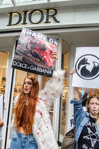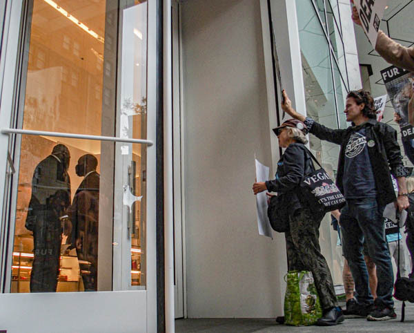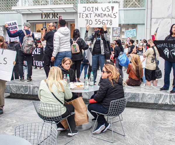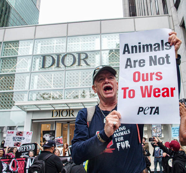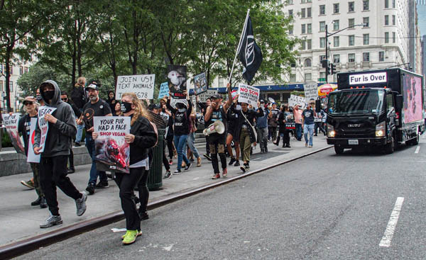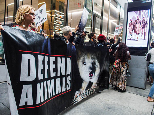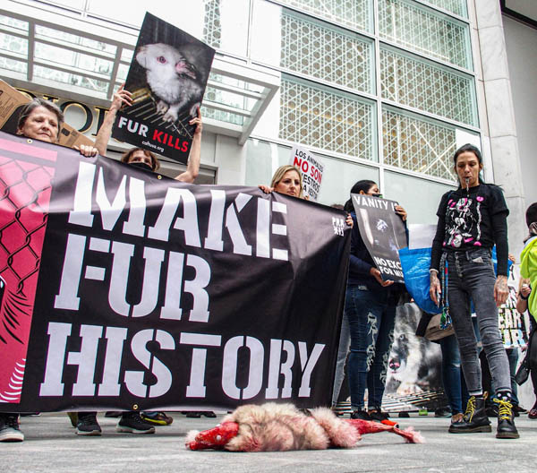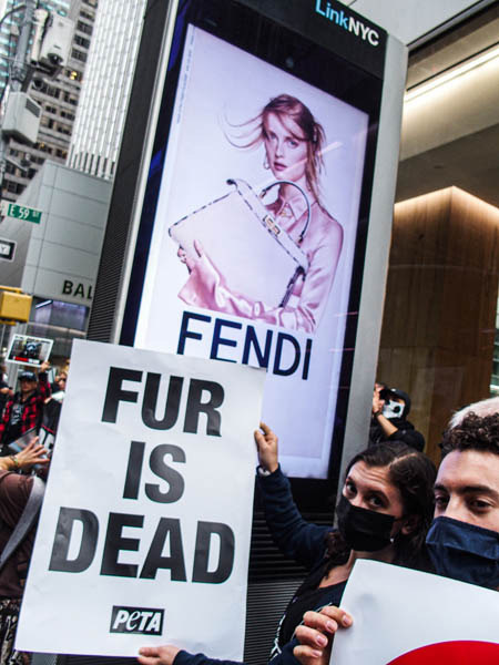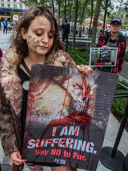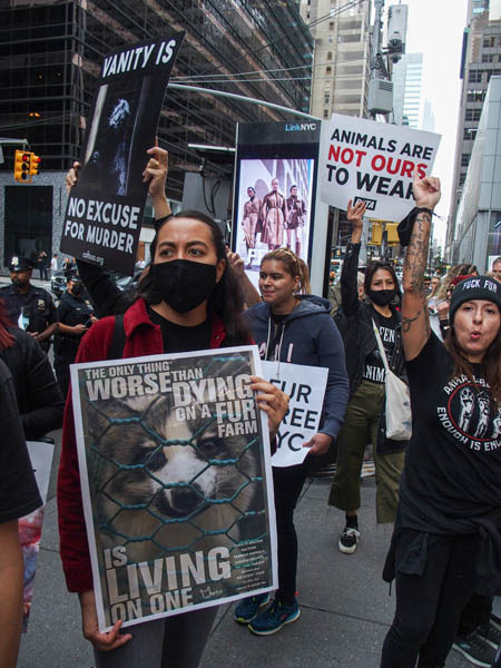 Protesters come together to rally against fur production and fur trade as well as animal rights on 59th street in Midtown Manhattan. Starting from Pulitzer fountain and marching to Central Park where horse carriages are stationed, they continued to several selected stores such as Dior and Celine and more to protest their sales on furs. As a global movement other cities in the US and UK marched on what is considered International Anti-Fur March day. Several key figures and activists were asked to speak and lead the marches. October 09, 2021