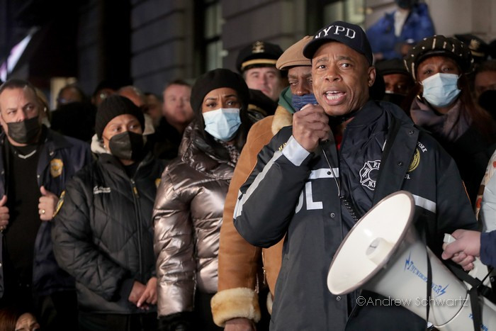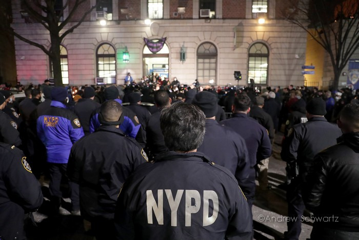 Hundreds of police officers, FDNY officers and members of the public are gathered outside the 32nd Precinct during a candlelight vigil for two officers that were shot in New York City on January 22, 2022.