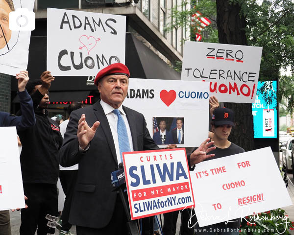 New York, N.Y.. Republican Mayoral candidate Curtis Sliwa holds a press conference in front of New York Governor Andrew Cuomo’s Manhattan office for him to to step down after sexual misconduct charges were found after an investigation by the New York State Attorney General Latisha James were found to be credible.