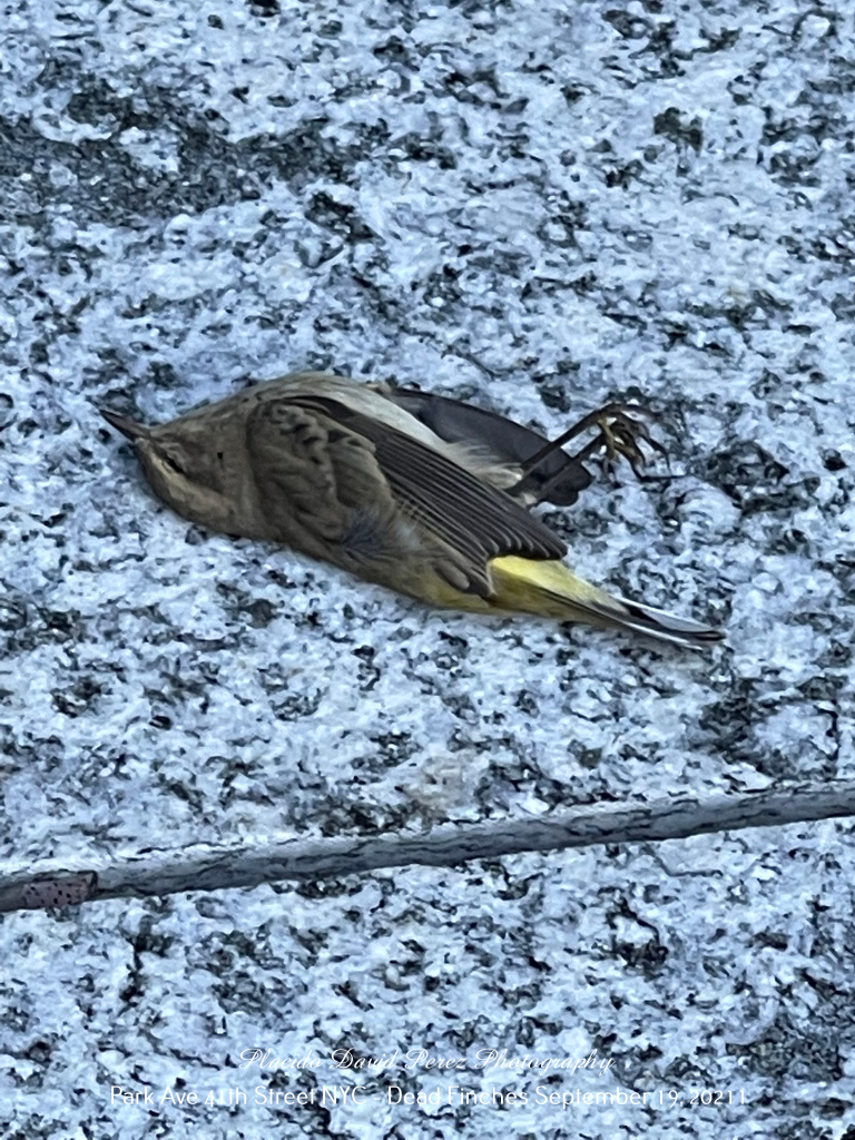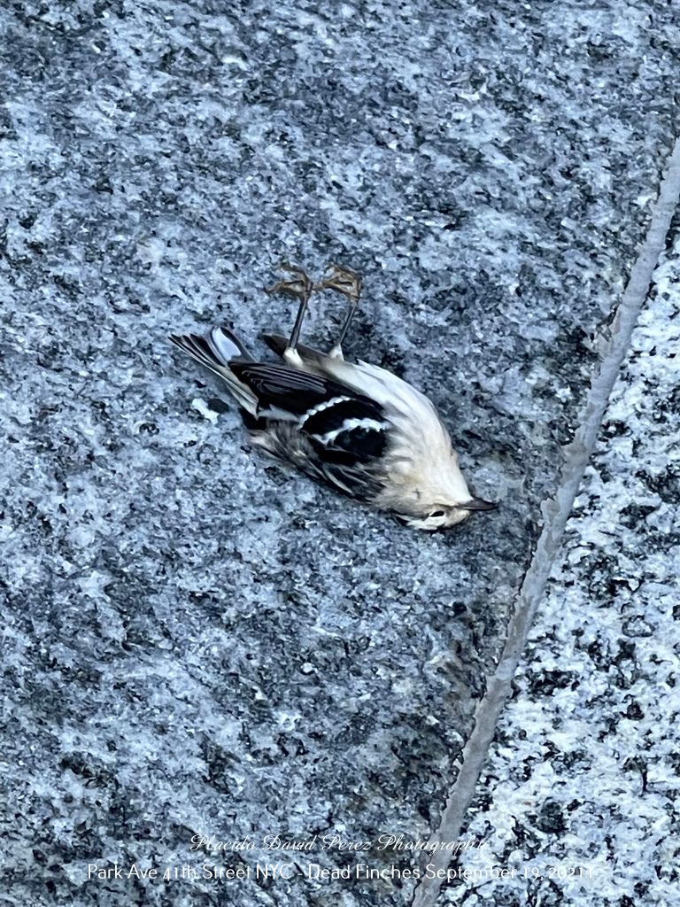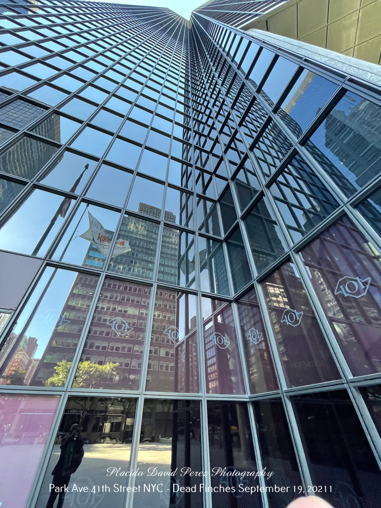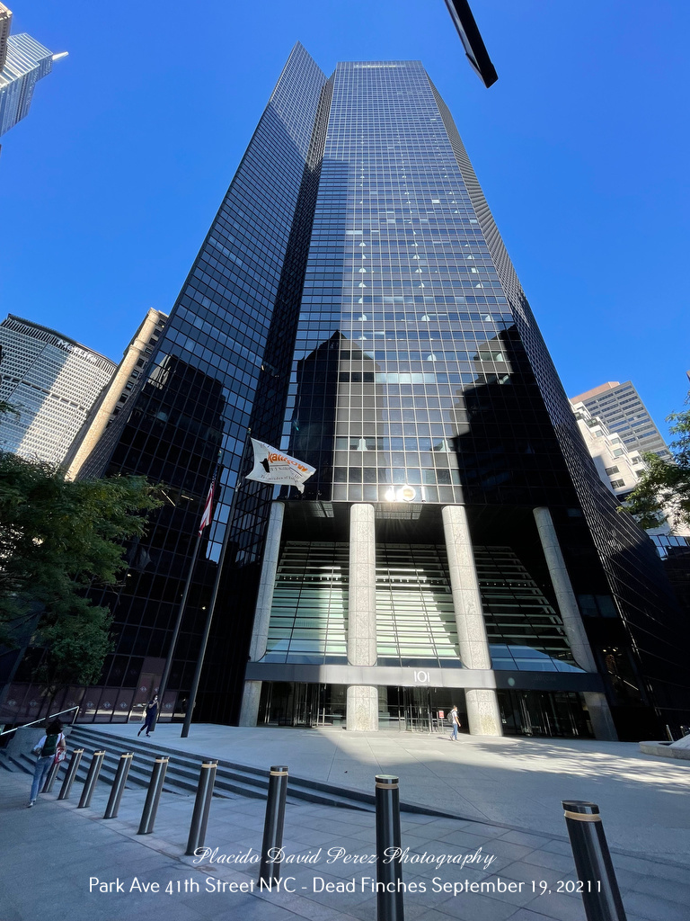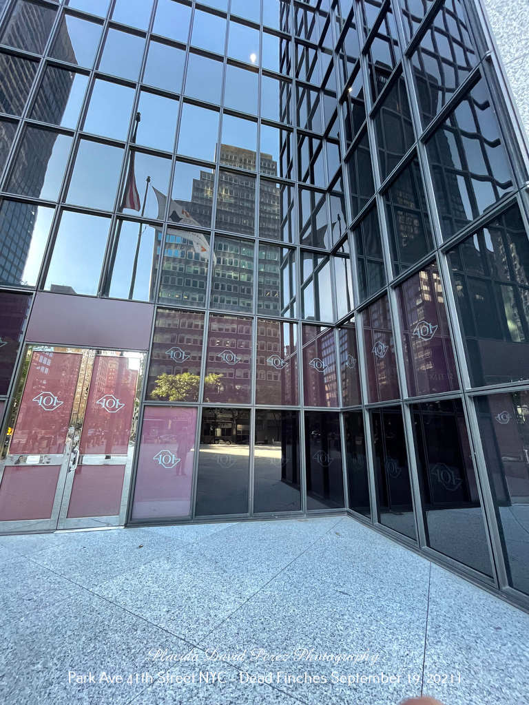 On Sunday September 19, 2021 I was at 41th Street and Park Ave in front of 101 Park Avenue. When I noticed what appeared to be birds flying directly into the glass pane windows and falling to the ground. Upon further inspection, I noticed that there were various dead small Finches all around the ground of this property. It seems that the birds are flying directly into the Black reflective glass and casing injury or dead to themselves.