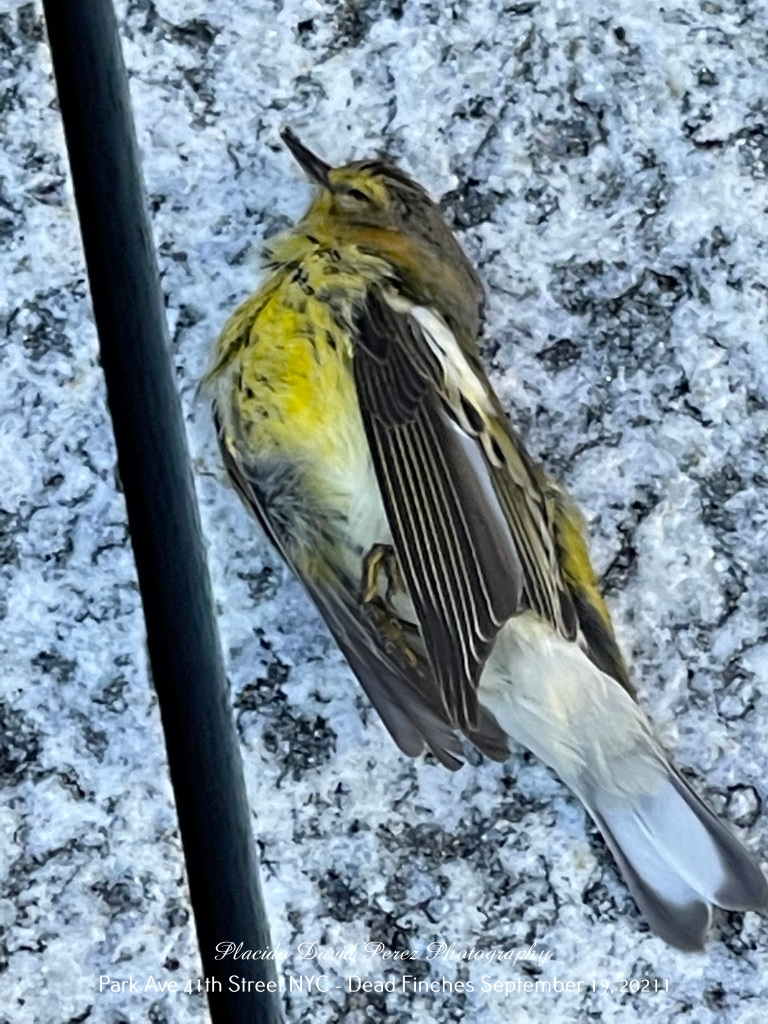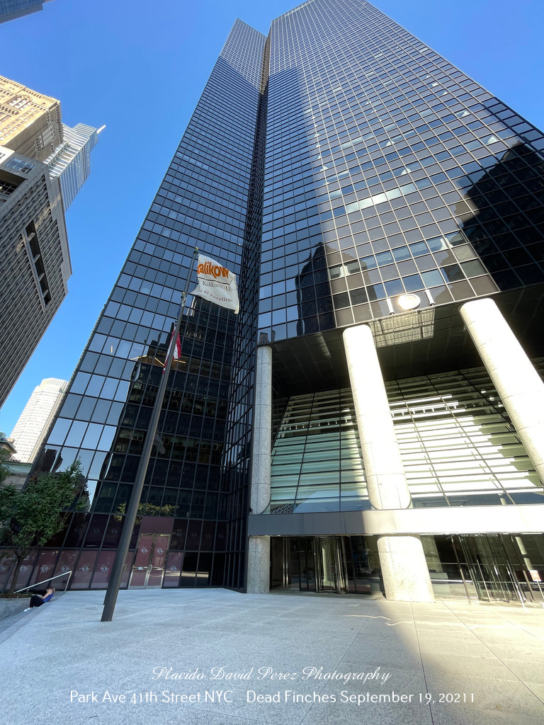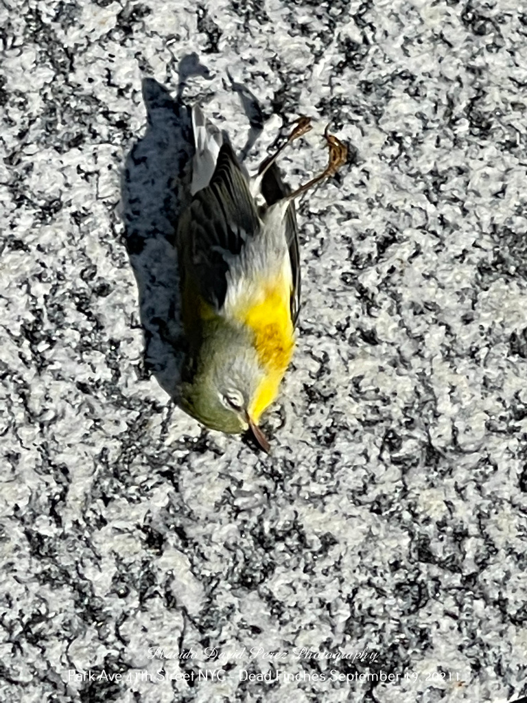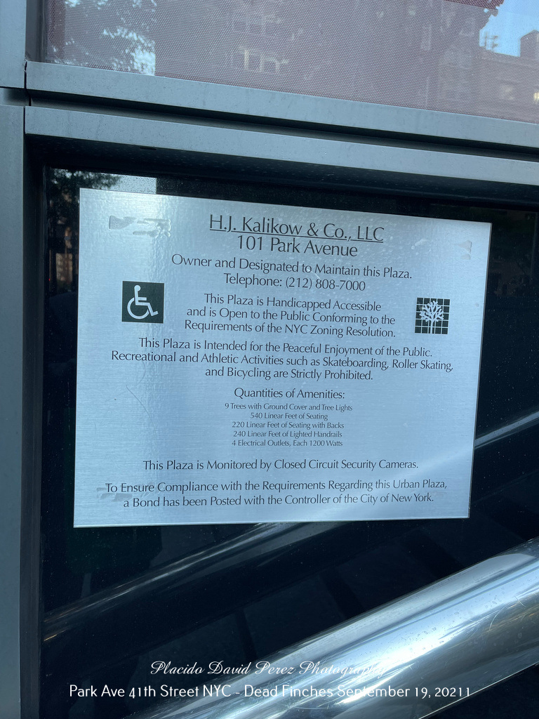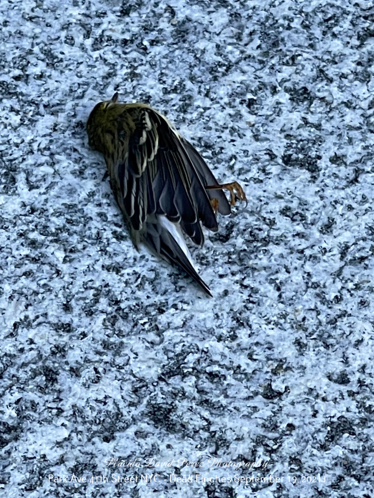 On Sunday September 19, 2021 I was at 41th Street and Park Ave in front of 101 Park Avenue. When I noticed what appeared to be birds flying directly into the glass pane windows and falling to the ground. Upon further inspection, I noticed that there were various dead small Finches all around the ground of this property. It seems that the birds are flying directly into the Black reflective glass and casing injury or dead to themselves.