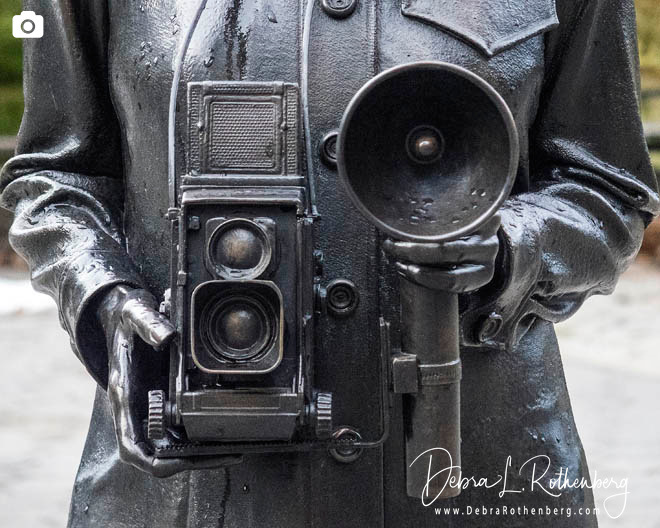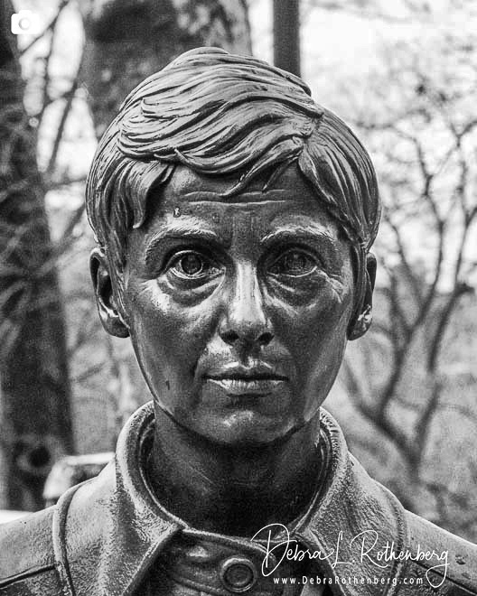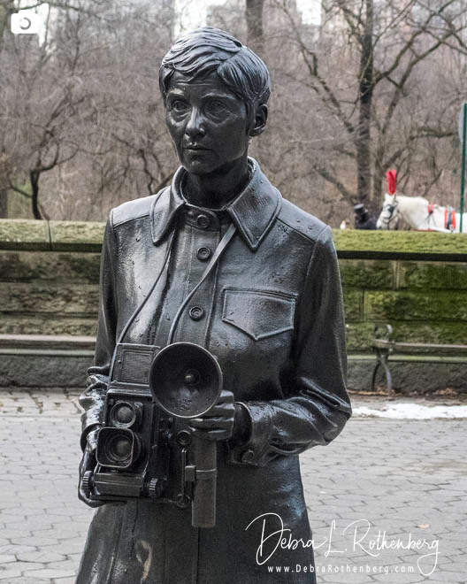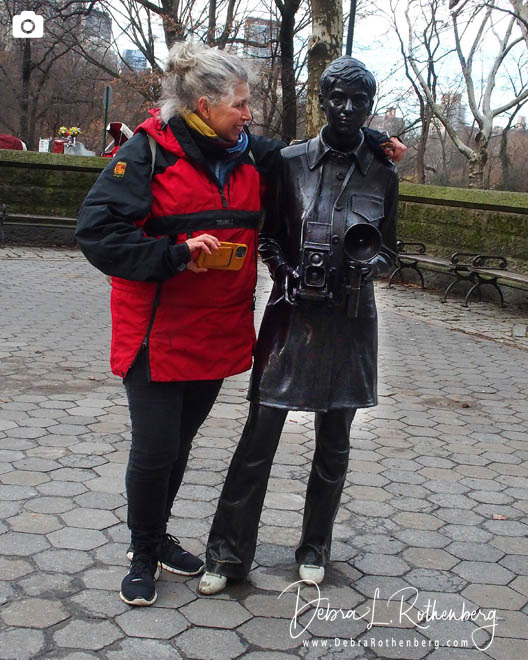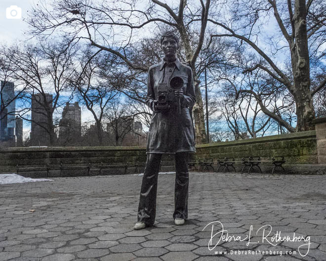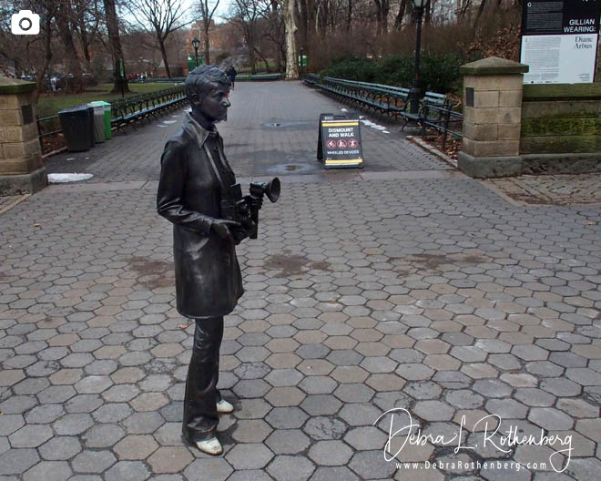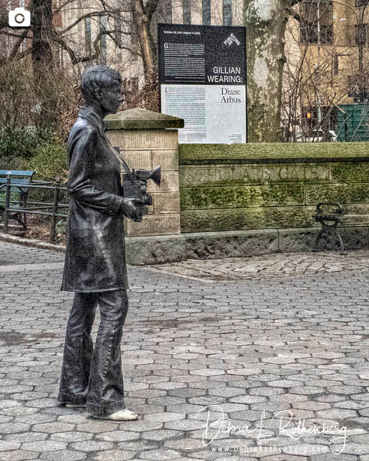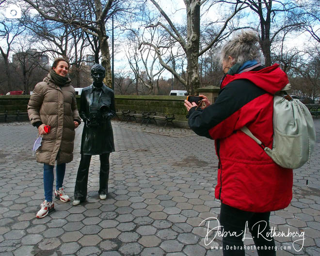 A bronze statue honoring the late photographer Diane Arbus by British conceptual artist Gillian Wearing in Doris C. Freedman Plaza in Central Park in New York City until August 14, 2022. The statue is presented by the Public Art Fund.
