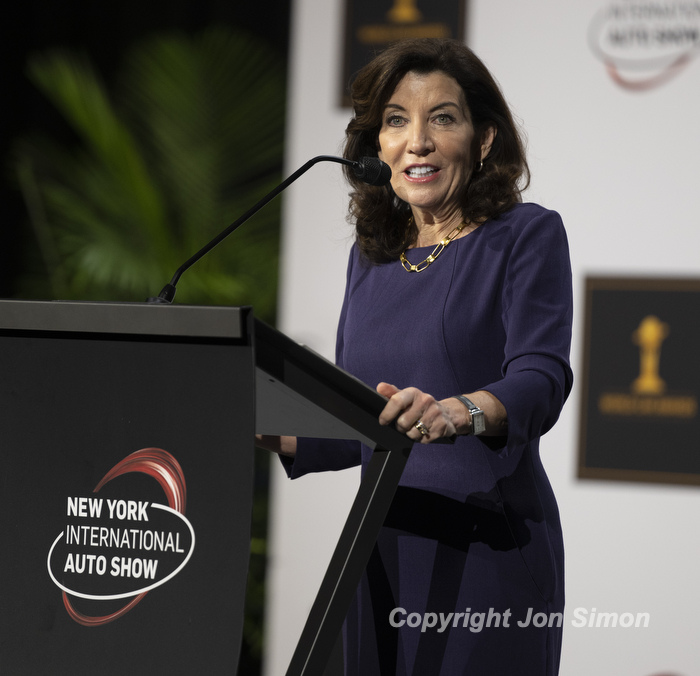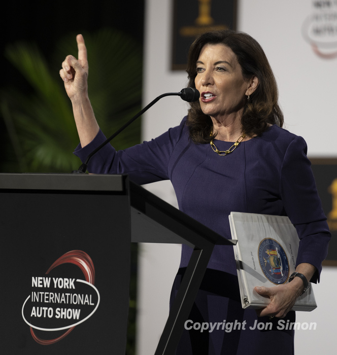 After a 2 year hiatus, NY Governor Kathy Hochul welcomes the International Auto Show back to the New York Javits Center 4/13/2022. The Governor announced electric vehicle programs are coming to New York, and encouraged people to try the EV test track. EVolve EV fast chargers are planned for LaGuardia Airport. The show has a variety of production and prototype vehicles, gas and electric.
