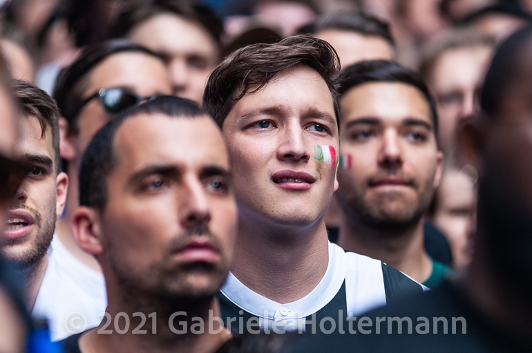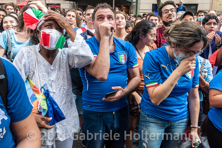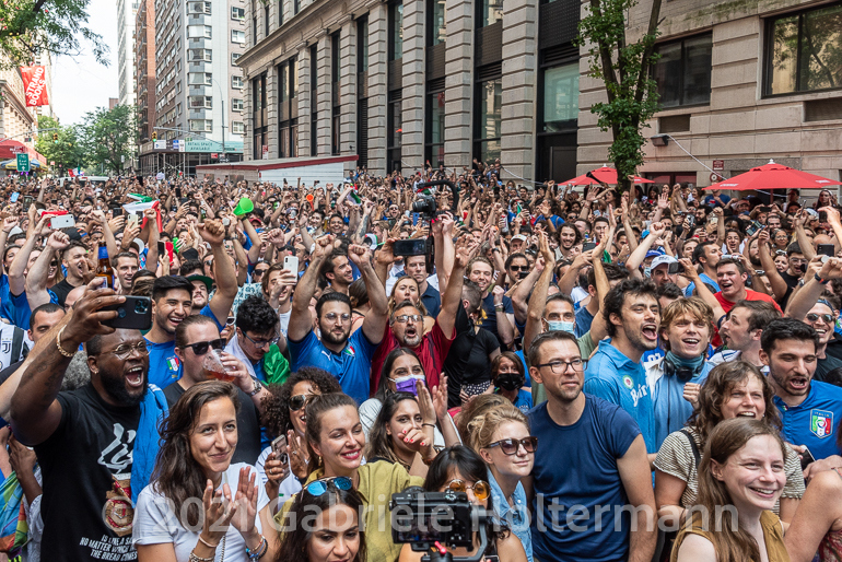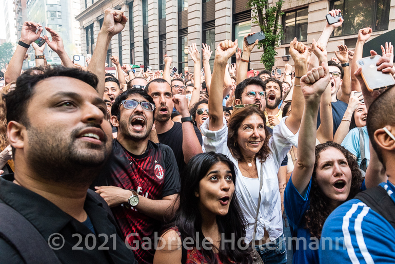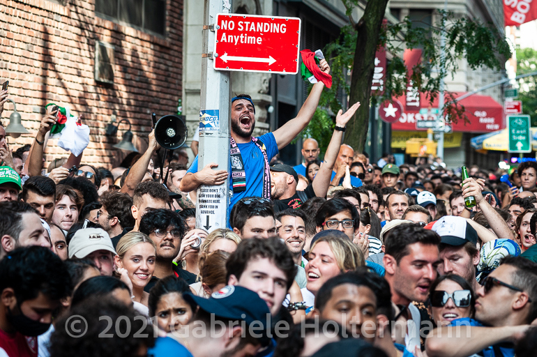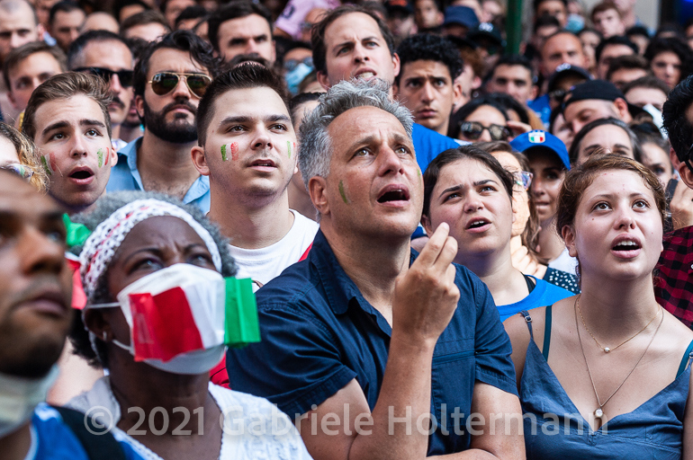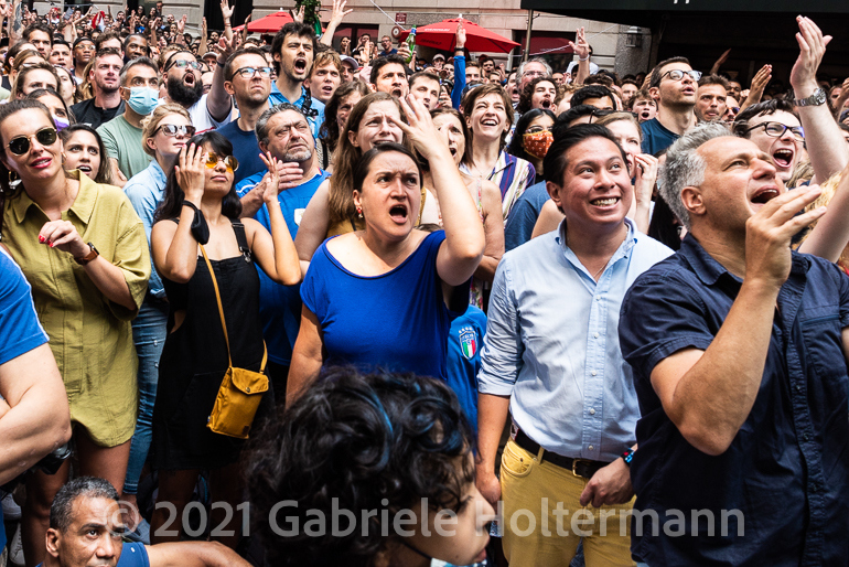 A few hundred Italy fans cheer on their Azzurri in the Euro Cup 2020 final against England outside Ribalta Italian restaurant on E12th Street in New York City on July 11, 2021. Italy beat the Three Lions 3-2 on penalties after a 1-1 draw.