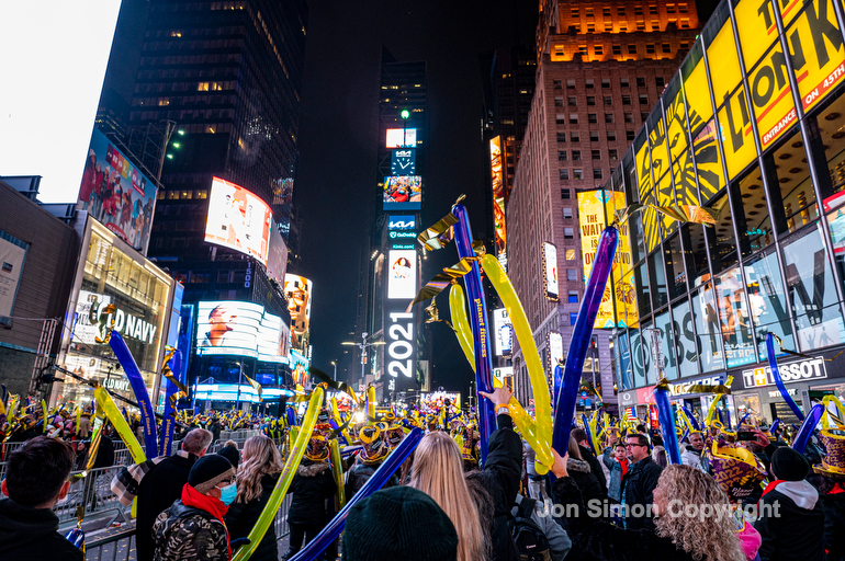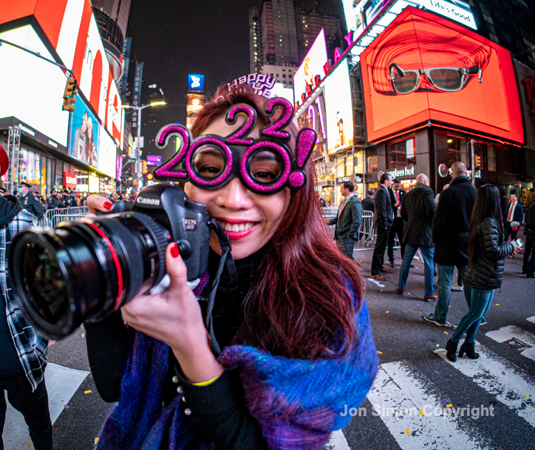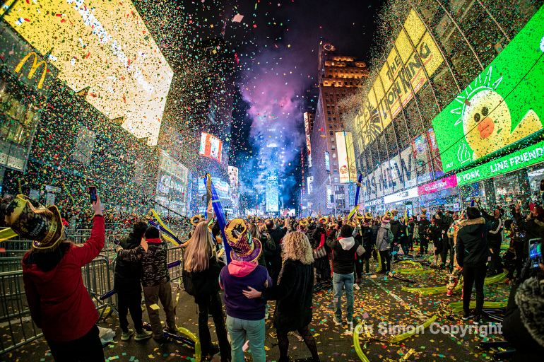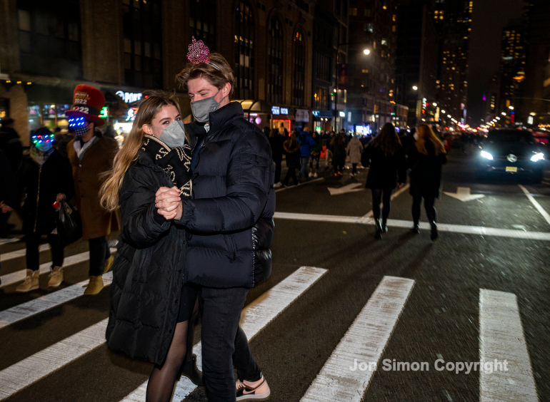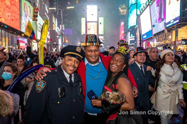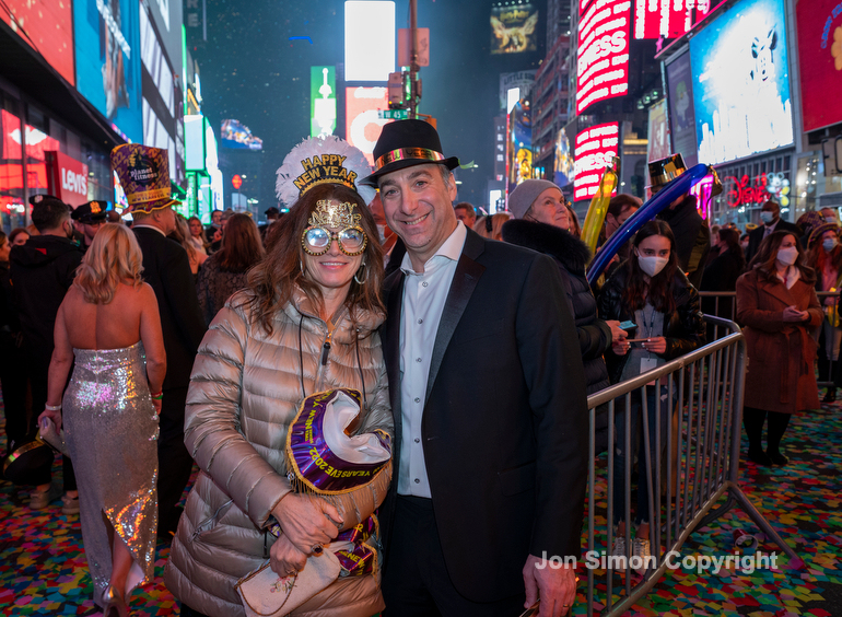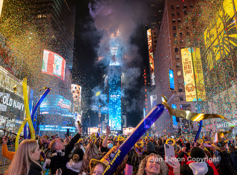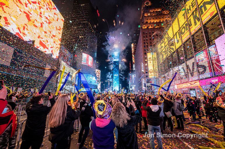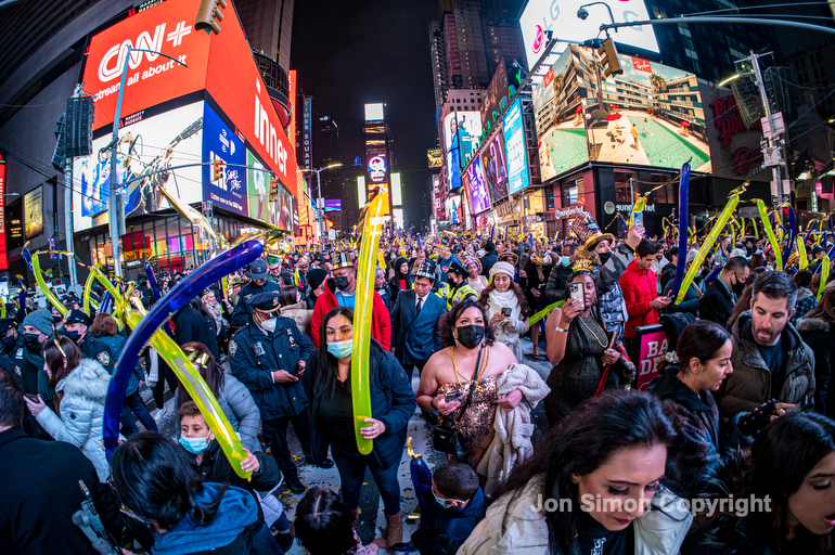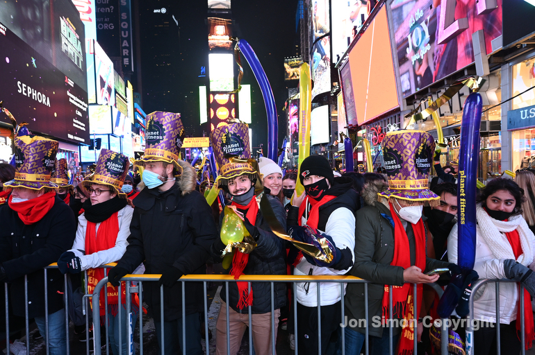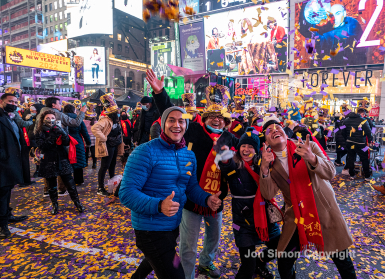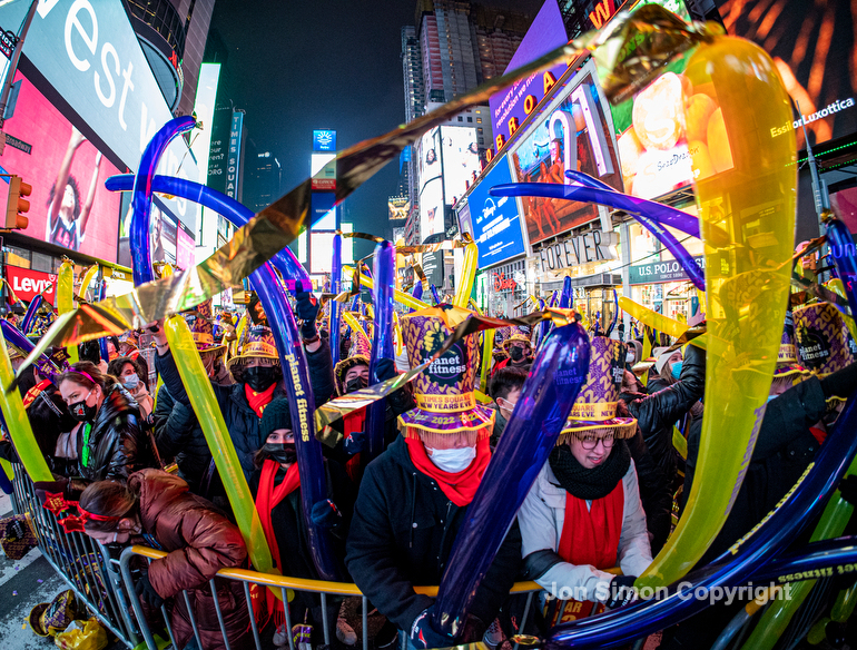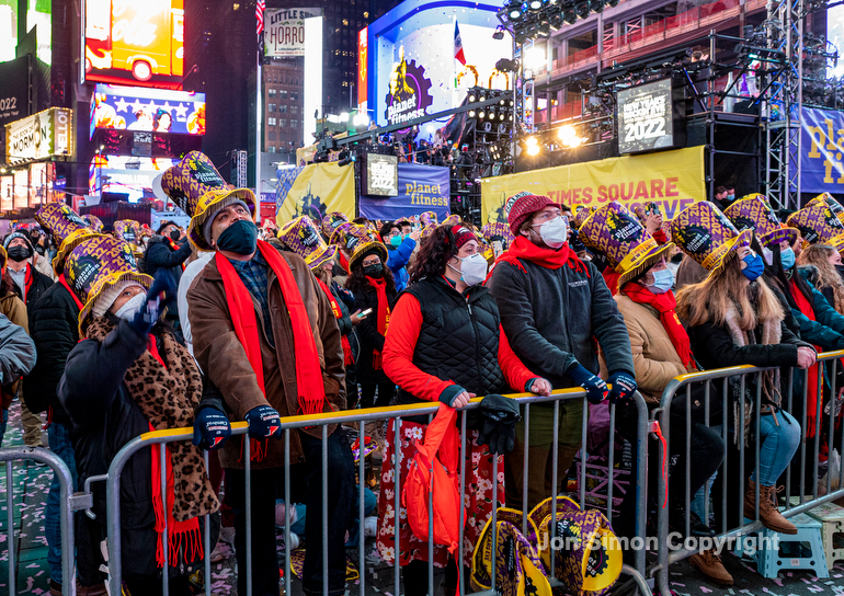 Revelers celebrate the New Year in Times Square 1/1/22. Although the crowds were smaller, 15,000 instead of 58,000, it appeared to be a very crowded celebration.