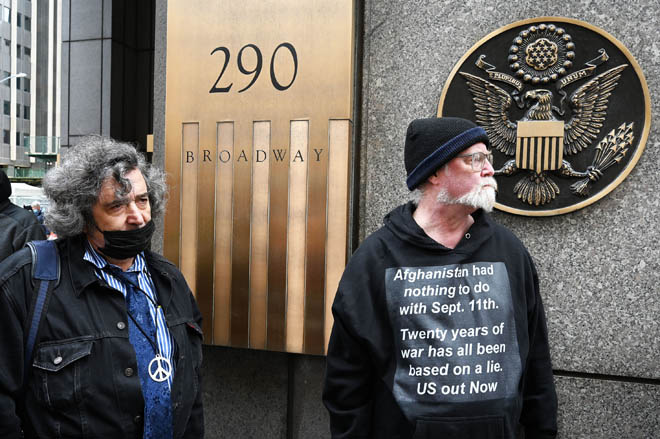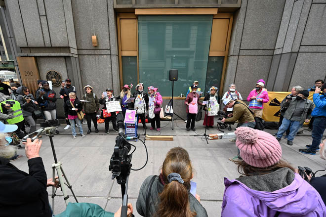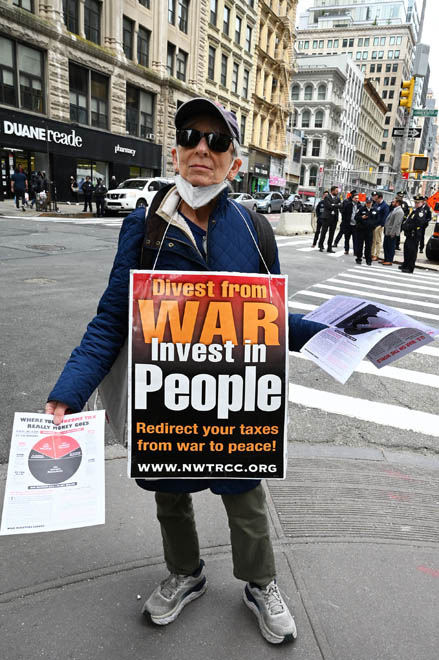 Members of Extinction Rebellion (XR) marked Tax Day with the “No Wars, No Warming” demonstration outside a federal building in NYC where Internal Revenue Service (IRS) have offices “to demand that our tax money stop being used to fund endless war and environmental destruction”, on April 18, 2022