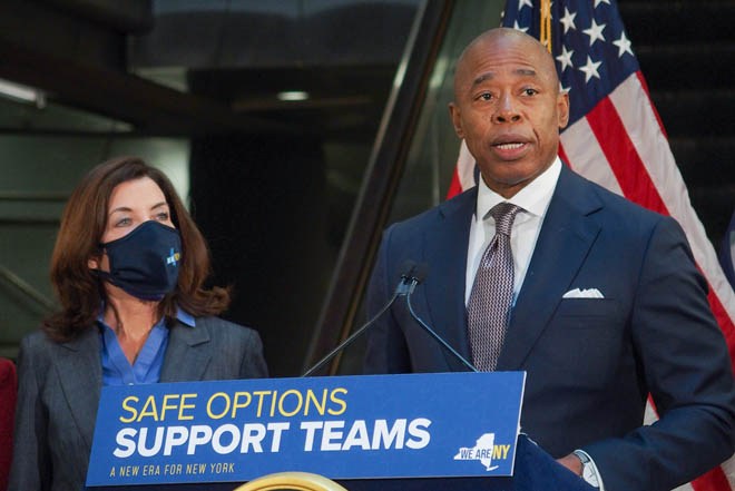 NY Governor Hochul and newly elected NYC Mayor Adams have their first public press conference together on 141 Fulton Street, to speak about homelessness and new social work implementations to thwart it as well as police deployment into the subways in NYC and the 5 boroughs. They also introduced the first female police commissioner of the NYPD, Keechant Sewell.