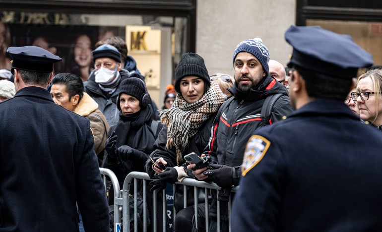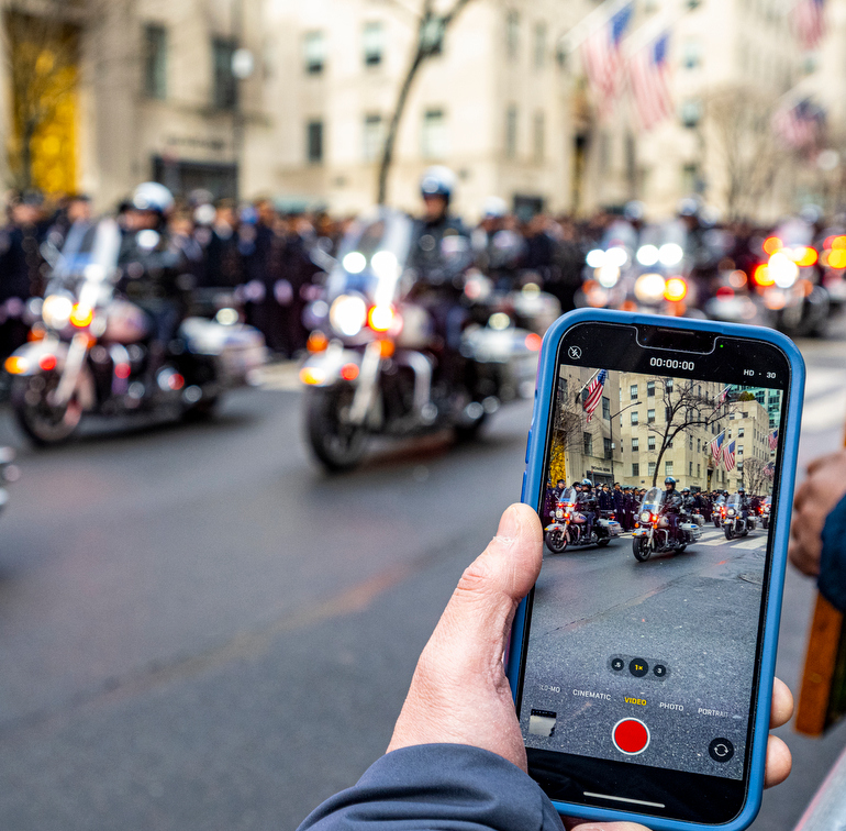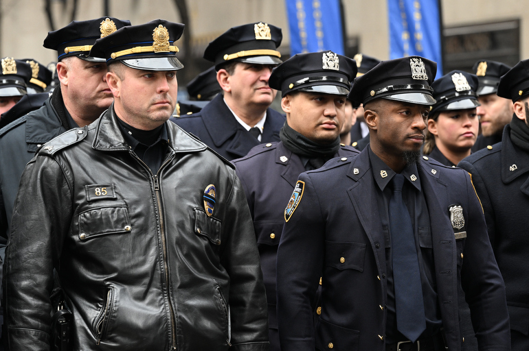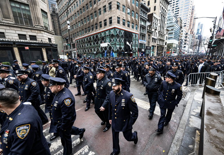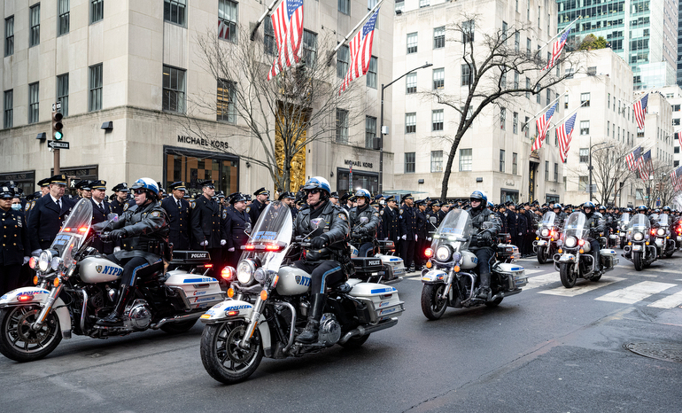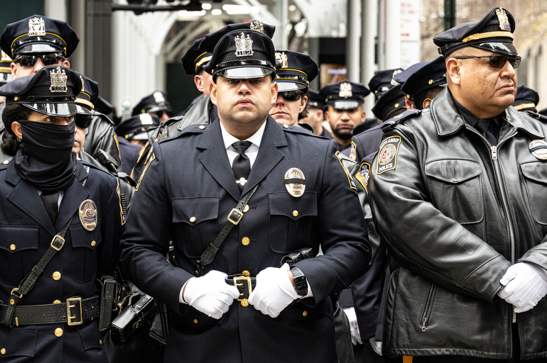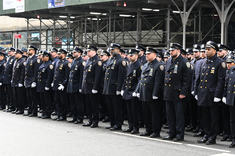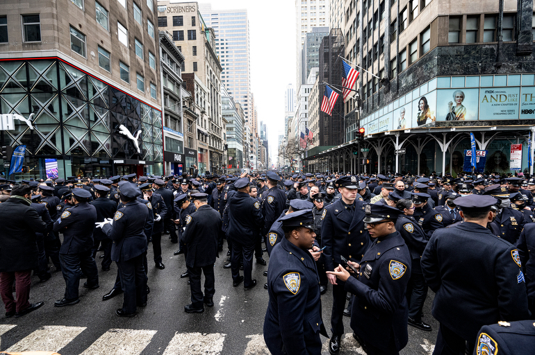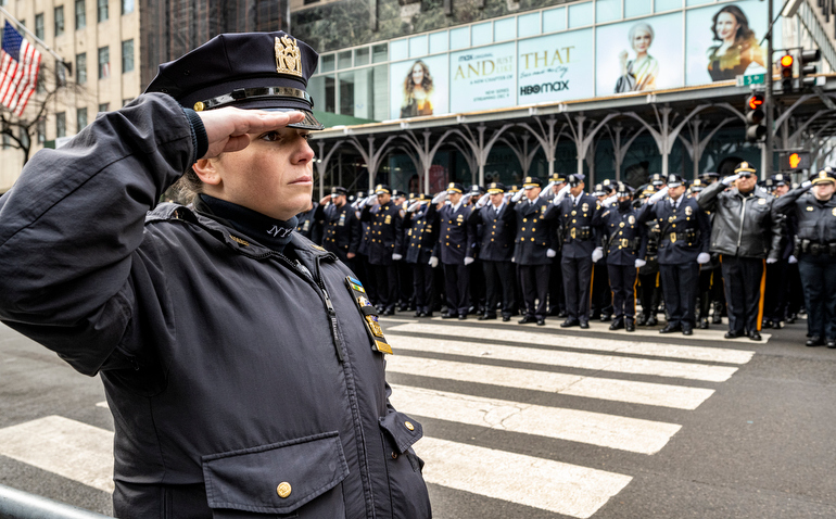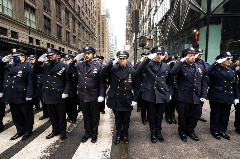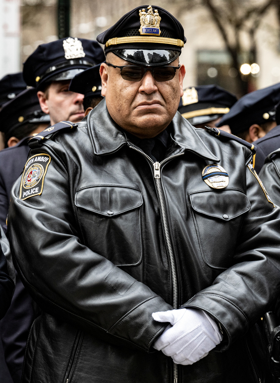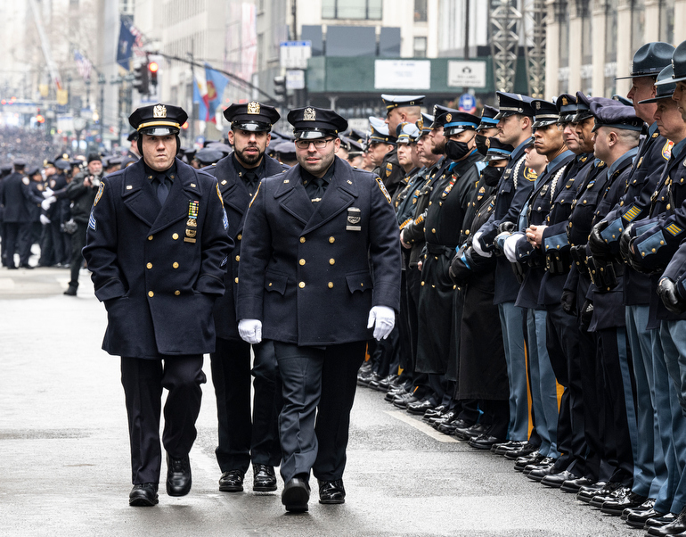 Police Officer Wilbert Mora was laid to rest 2/2/22 after being posthumously promoted to Detective First Grade, and eulogized at St. Patrick’s Cathedral. Thousands of police from all parts of the country lined Fifth Ave. as the procession carrying Detective Mora passed. Mora was gunned down along with his partner Jason Rivera, who passed away a few days earlier. Here an officer stands guard by St. Pat’s.