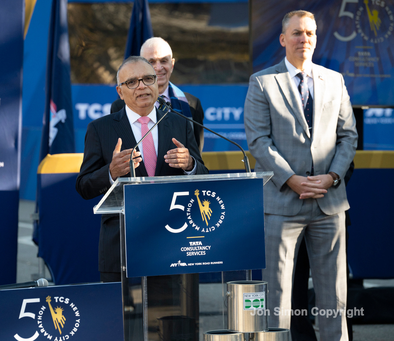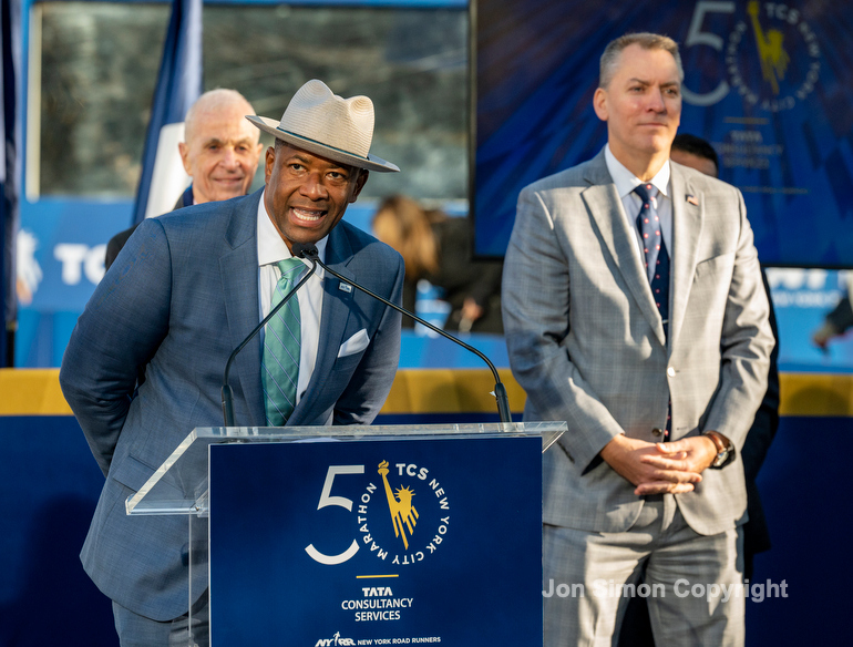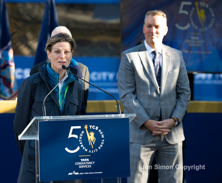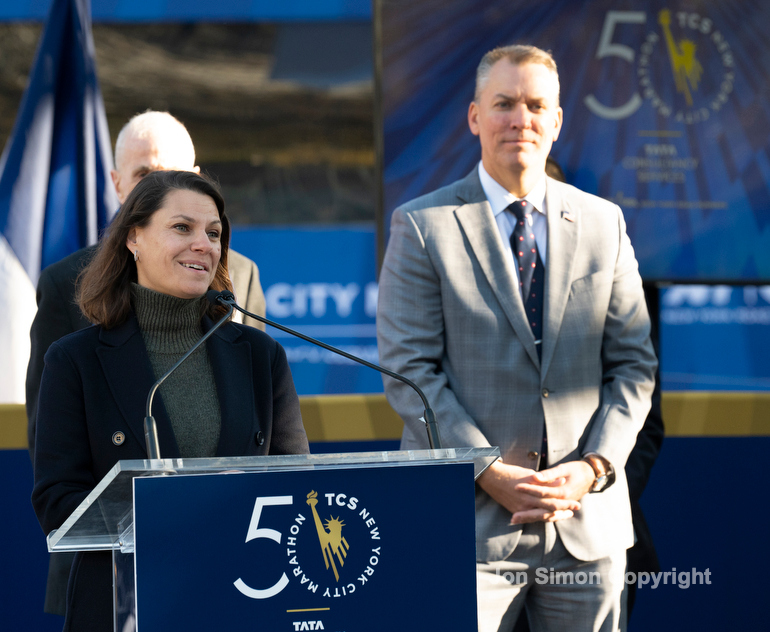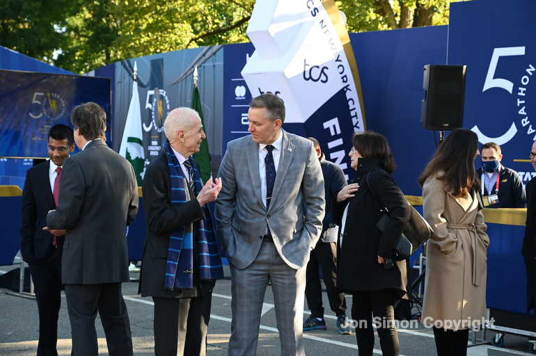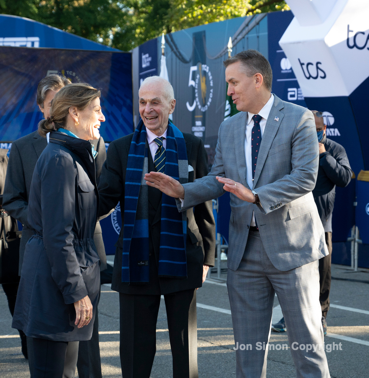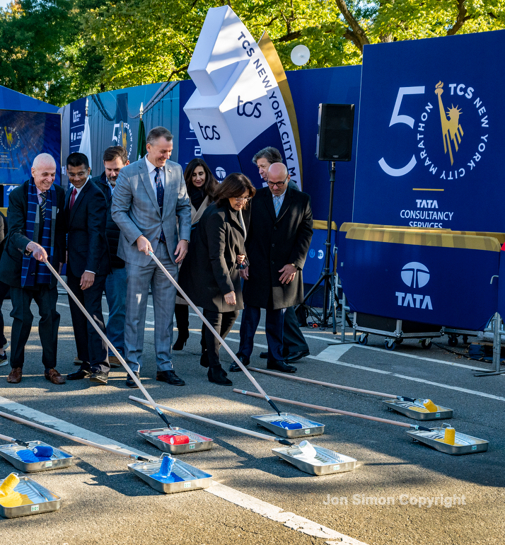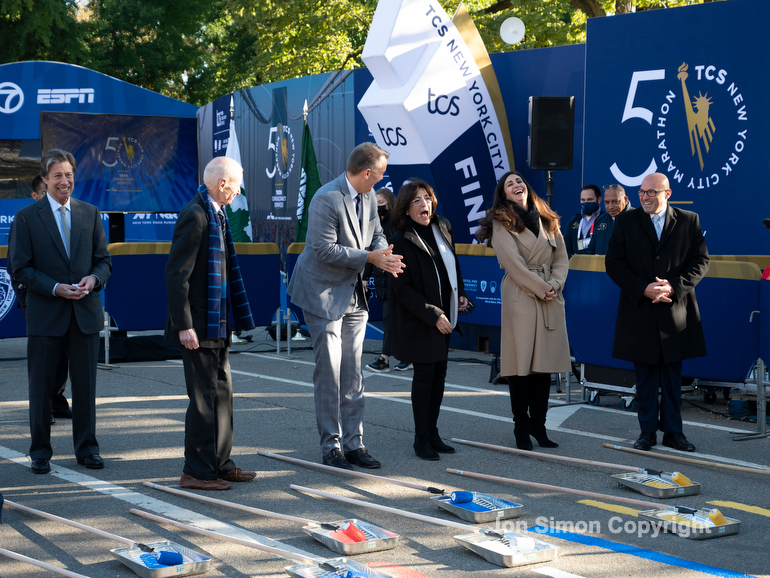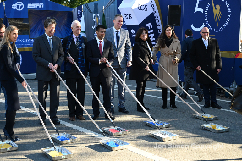 Police Commissioner Dermot Shea and various dignitaries attend NYC Marathon blue line painting ceremony at the finish line in Central Park 11/3/21. L-R Geroge Hirsch NYRR, Ted Metellus NYRR Race Director, Dermot Shea NYC Police Commissioner.