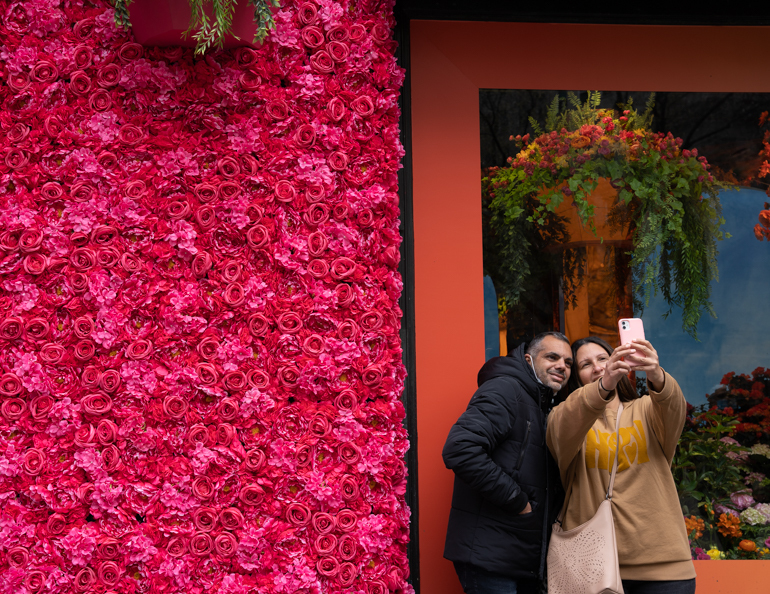 Visitors pose with the multitude of flowers both inside and outside the Macy’s Department Store during the annual Macy’s Flower Show on 34th Street and Broadway in New York City on March 27, 2022.