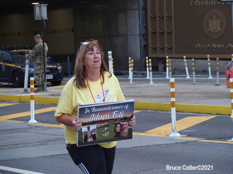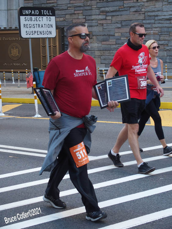 Service members adorned with images of those lost and holding flags lined the streets in support of the runners as they passed through the tunnel and ran their way through lower Manhattan to the finish line. Runners start in Brooklyn run thru the Hugh L. Carey Tunnel and end the run by the Freedom tower in Manhattan.