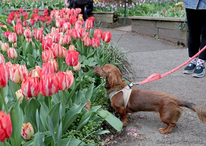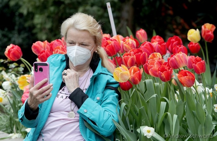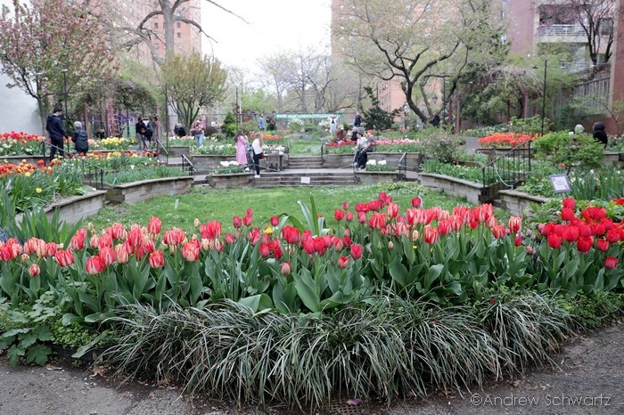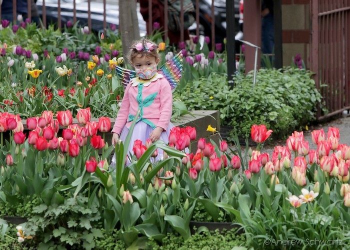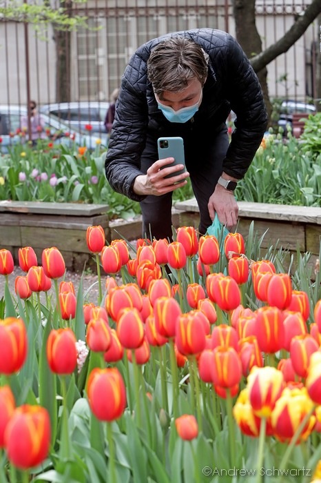 Children and adults attends the West Side Community Garden’s 2021 Tulip Festival on West 89th Street in Manhattan NY on April 18, 2021. The annual festival features close to 100 varieties of tulips of all shapes and sizes in full bloom inside the garden on the upper west side of Manhattan.