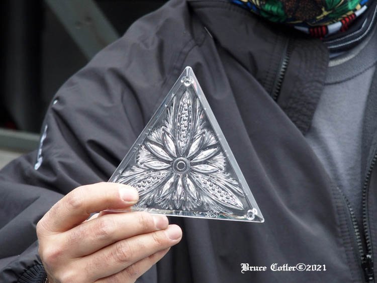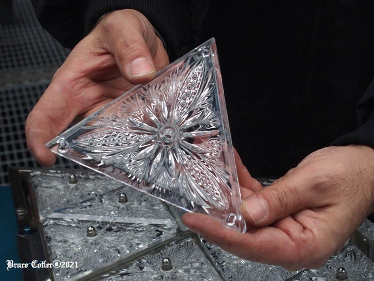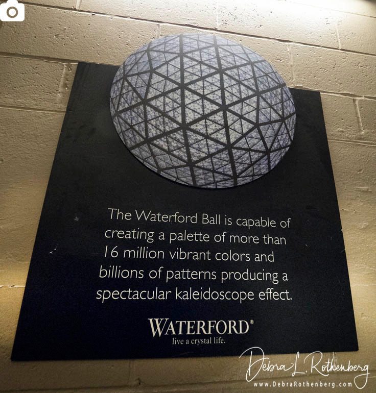On Times Squares New Year’s Eve Ball.The Waterford Crystal New Year’s Eve Ball is a geodesic sphere, 12 feet in diameter, and weighs 11,875 pounds. The Ball is covered with a total of 2,688 Waterford Crystal triangles that vary in size, and range in length from 4 3/4 inches to 5 3/4 inches per side. For Times Square 2022